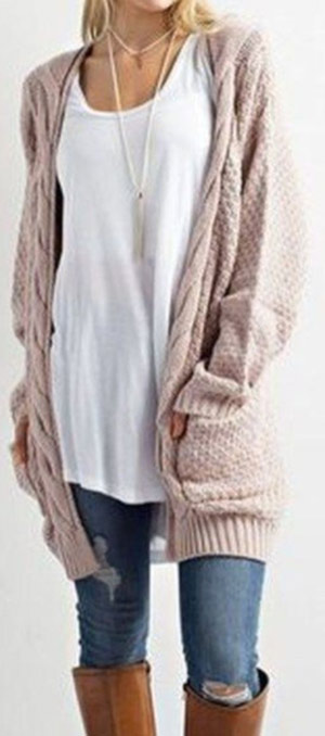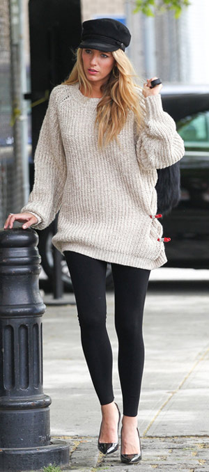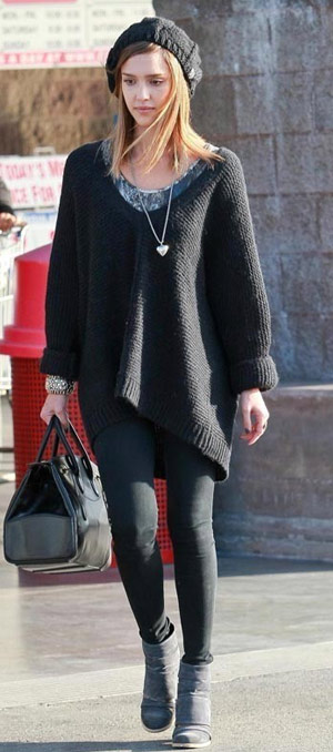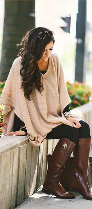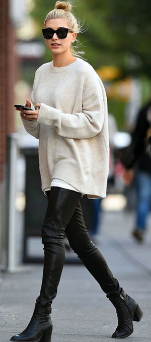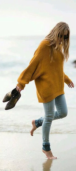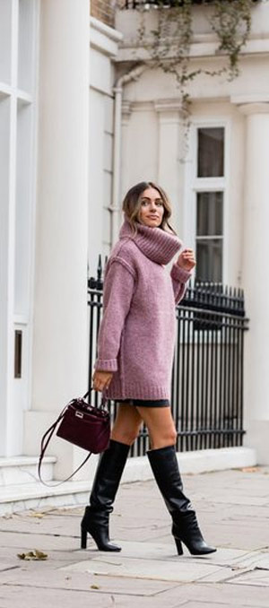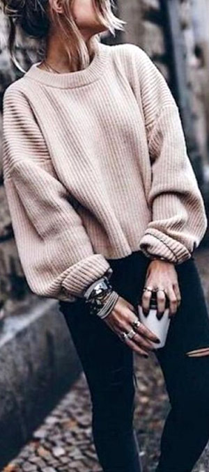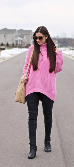 The combo of right colors can make you look more stylish than ever. Try your pink oversized sweater with blue jeans and black accessories like booties, sunglasses, hat and so on. This is a sweet girly look for young ladies who want to feel the coziness.