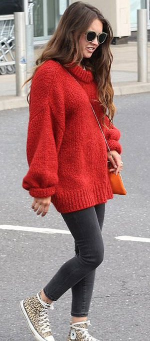 If you like to layer up in a vintage fashion you can try the following idea. Dress your red oversized winter sweater, only the front side tucked into the blue old looking jeans. Also, carry a vintage style side bag and slip on black pumps to add perfection.