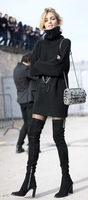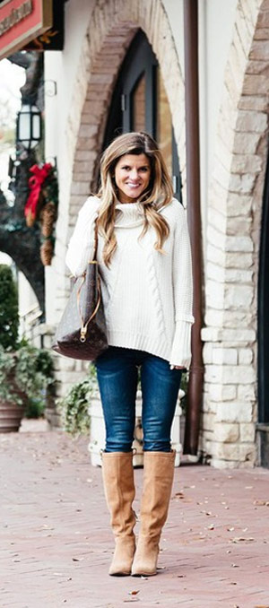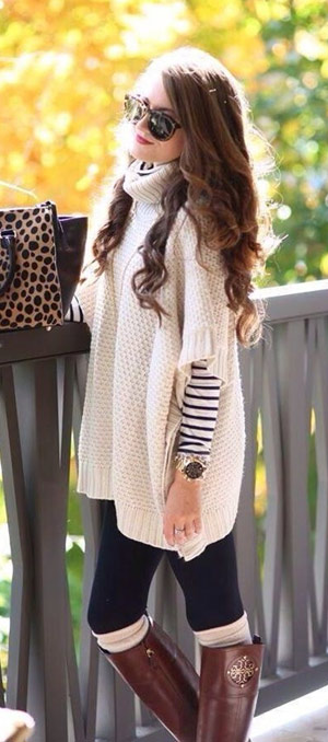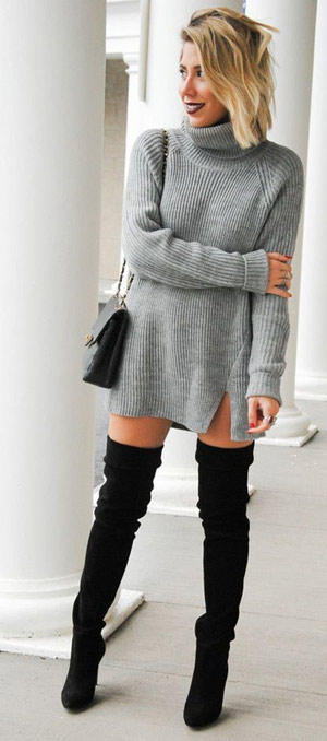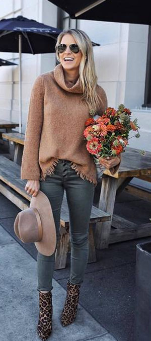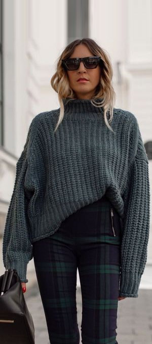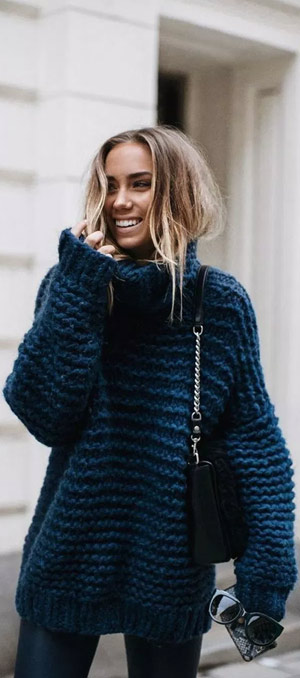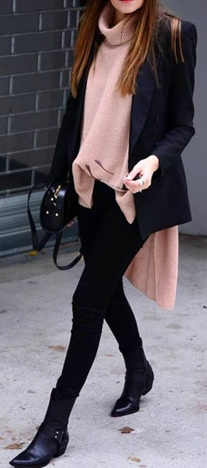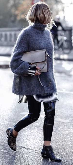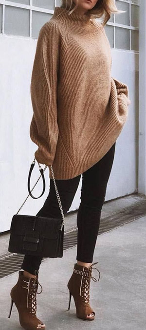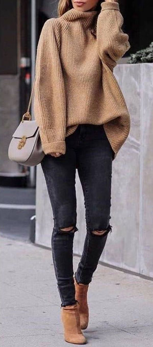 When it comes to the frozen times you will be glad to wrap an oversized turtleneck sweater over any kind of top. This outfit becomes coolest by adding black skinny jeans that have a zipper at the bottom of one leg-side.