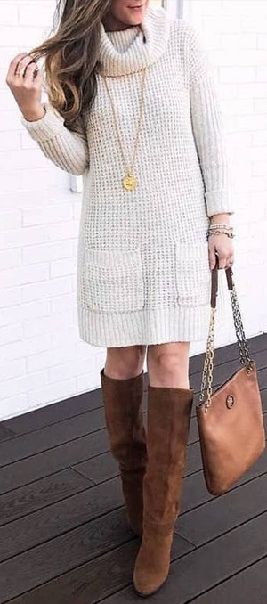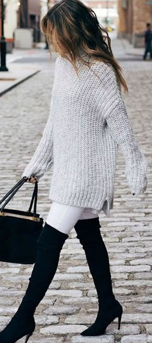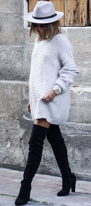 Oversized sweater only half tucked into a short skirt look surprisingly cool. You can put on your sock black boots that give an added impression to this attire. You can also renew this look by entirely tucking in the sweater into your skirt. The second one is more feminine than the first one that showcases a funky style.