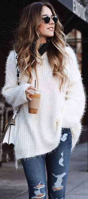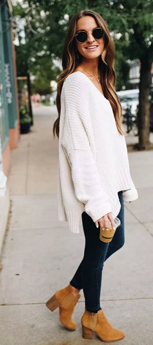 If you like to wear something warmer plus look trendy, you can wrap a large white sweater over your denim shirt. Finish the look by wearing black skinny jeans and ankle boots, an absolute cozy effortless styling yet no tress of dullness.