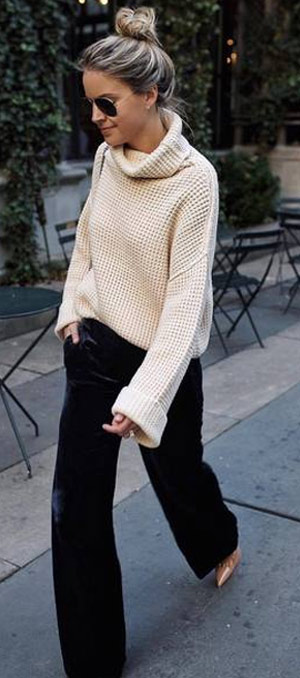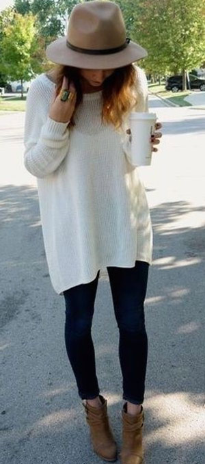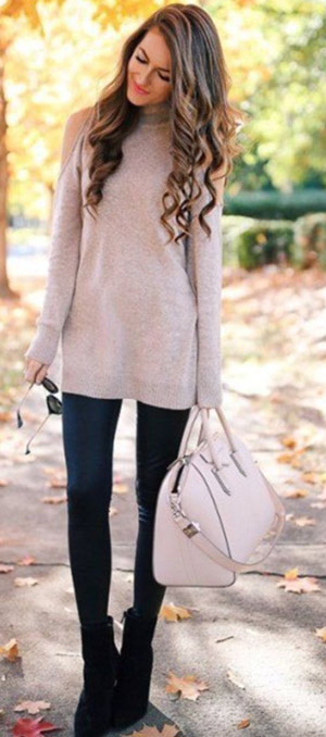 Off-shoulder tops have become the newest trend; the great news is even in this cold season, you can outfit it. A bulky oversized off shoulder sweater tucked in skinny pants looks really hip. You can put on ankle-toe booties to look more glamorous.