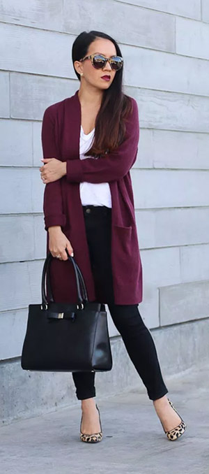 A red oversized sweater with floral printed wide pants offers an extraordinary styling vibe moreover; this outfit is suitable for busy days. You will find coziness in this attire in the frosty season. Finish off the look with simple black heels and large floral purse.
