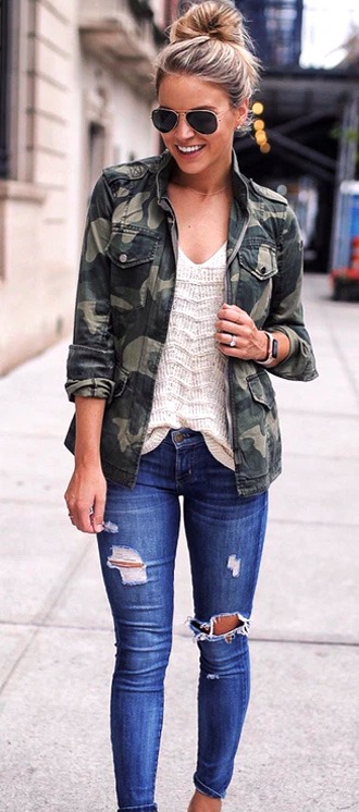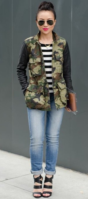 Rock the world with your stylish camouflage printed jacket over your usual tee paired with skinny blue jeans. You need the combat boots to finish off the look. To look funkier you can wear a boyish hat and then, you are ready to walk on the streets with your coolest outfit.